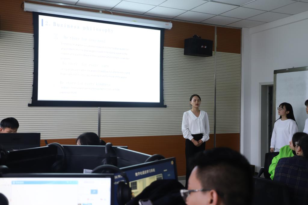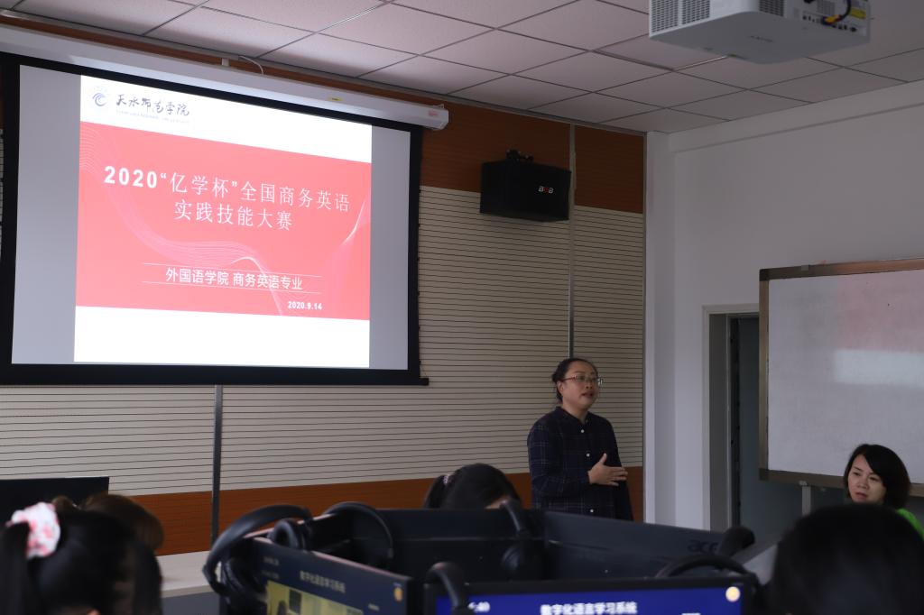 为加快培养具有国际视野、通晓国际规则、能够参与国际事务和竞争的国际化人才,巩固高校大学英语和英语专业教育教学改革成果,展现新时代高校学生的中国情怀和国际视野,外国语学院商务英语专业于9月14日举办了2020“亿学杯”全国商务英语实践技能大赛的选拔赛。副院长马金海,商务英语系主任,任课教师,以及2019级商务英语一班的全体同学观摩了本次比赛。