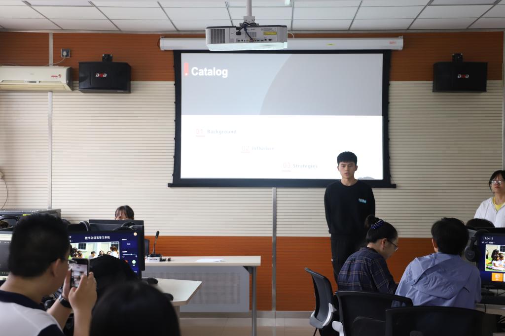 比赛中,参加选拔赛的三支队伍按照赛前抽签决定的顺序依次上台,根据比赛要求,以某企业在新冠疫情影响下所面临的机遇与挑战为主要内容,进行企业发展策略的主题演讲。每支队伍分工明确,配合默契,以饱满的热情和流畅的表达向大家进行了精彩的展示,现场效果极佳。最终,第三组以其标准的发音,独特的视角和优秀的舞台展现力夺得了本次比赛的冠军。各位评委老师也在比赛结束后对每支队伍的表现进行了点评,肯定了各位选手们的付出也指出了不足之处,以期选手们在今后的比赛中有更好的发挥。