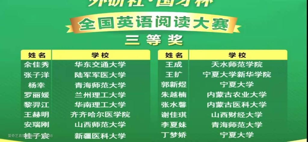 12月20日,2020“外研社·国才杯”全国英语写作、阅读大赛颁奖仪式在北京举行,我校外国语学院英语专业17级一班的王成同学荣获全国阅读大赛总决赛三等奖。
