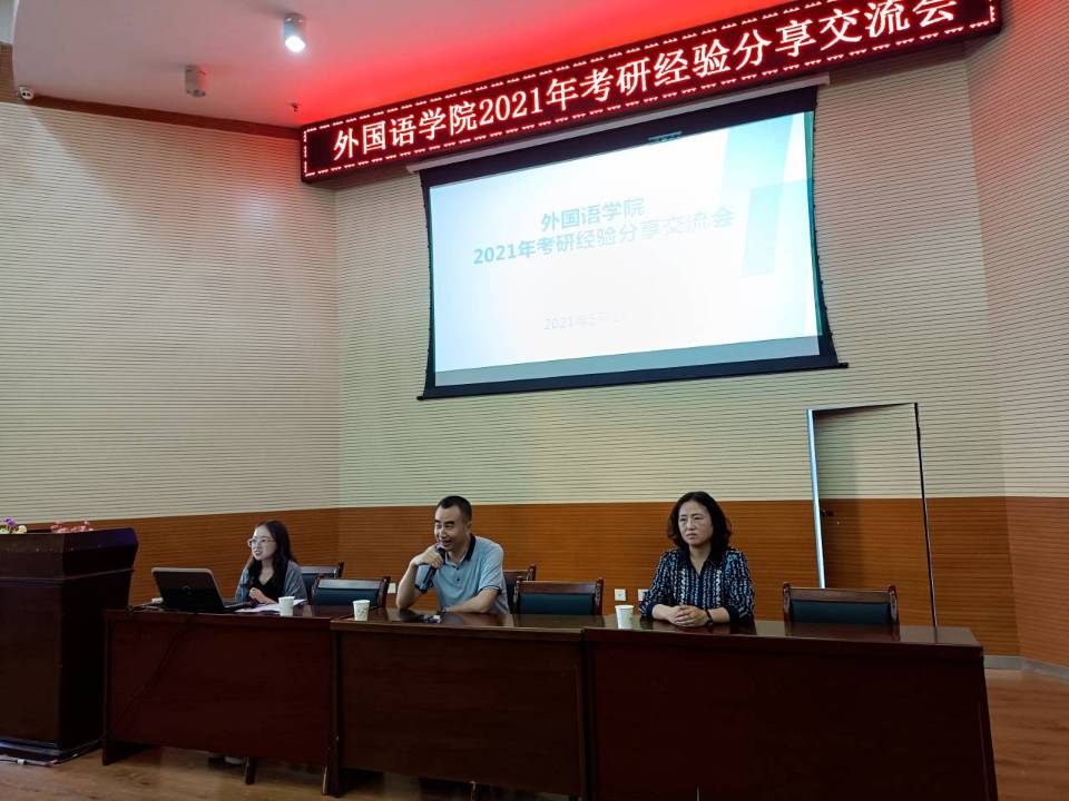 首先,外国语学院副院长杨江锋作开场发言,引导同学们认识“考研”,思考考研的“初衷”,提醒同学们考研不仅是一次考试,更多的是专业知识和心理状态的较量。“行百里者半九十”,杨院长告诫同学们不能对自己妄自菲薄,而是要坚定信念、放手一搏。同时务必明确自己为什么要考研,做出适合自己的发展路径规划,不要盲目跟风,“To 考 or not to 考,that is a question”。