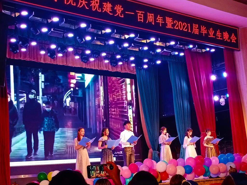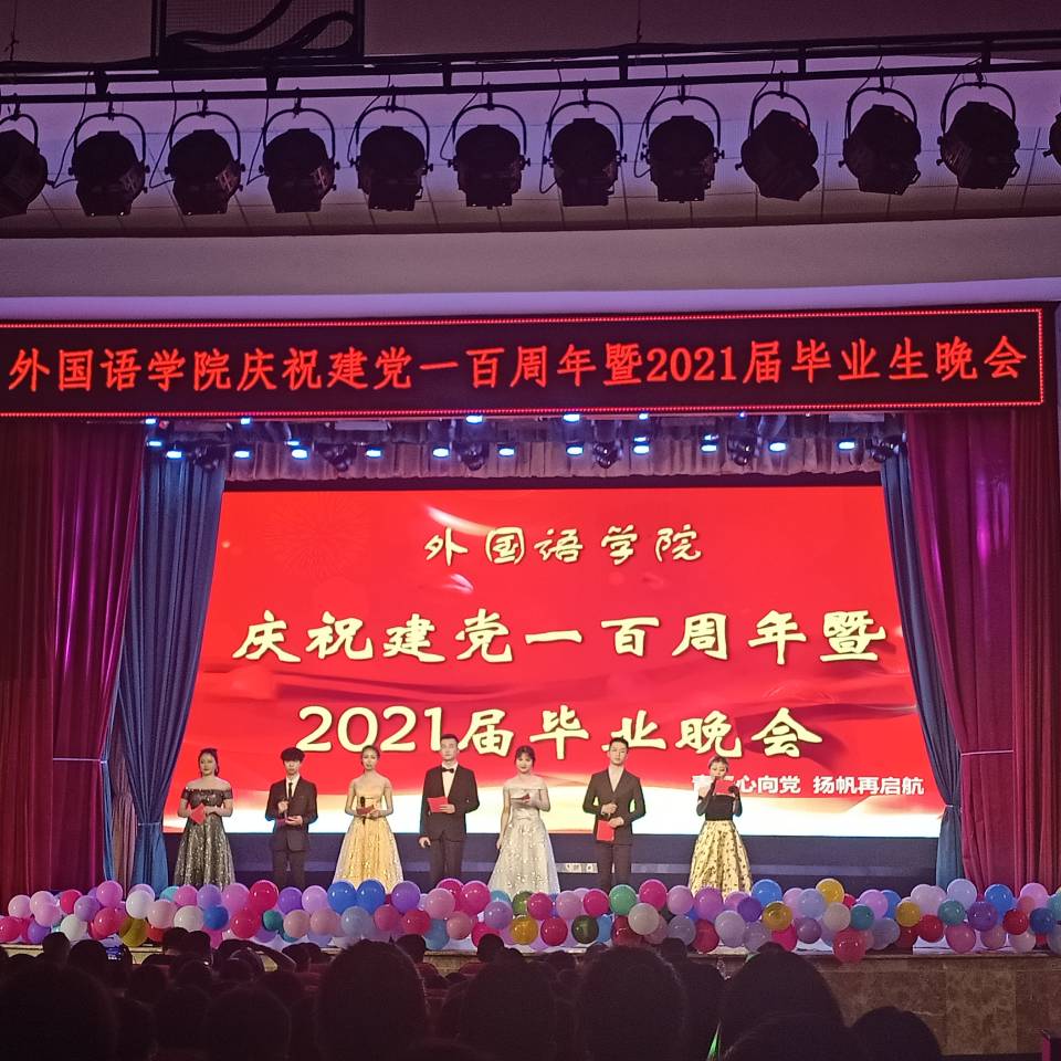 在这话青春、谈梦想、聊远方的诗意季节,外国语学院为2021届毕业生们呈现了一场精彩绝伦的毕业晚会。晚会以“庆祝中国共产党建党一百周年”为宏大背景和主题,由外国语学院团委学生会经过一个月的精心策划和筹备,于2021年5月29日晚在大礼堂精彩上演,晚会寄托了师生对毕业生“立志将个人发展融入祖国发展脉络”的殷切期盼。外国语学院党政领导、部分任课教师、毕业班全体班主任出席晚会,同毕业生们一同观看演出。晚会也同时邀请了外国语学院非毕业班全体同学和其他学院学生社团代表,歌声、掌声和欢呼声此起彼伏,烟幕、灯光和荧光交相辉映,现场氛围热烈。